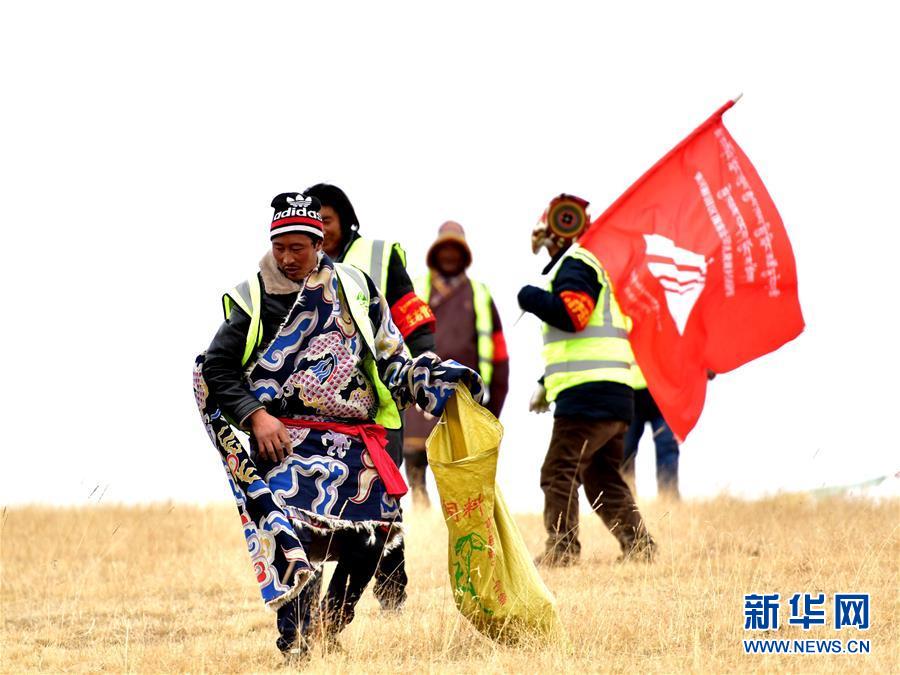 在三江源國家公園黃河源園區(qū),扎陵湖鄉(xiāng)生態(tài)保護站勒那村生態(tài)管護隊第七組的隊員在撿拾垃圾(2018年12月2日攝)。