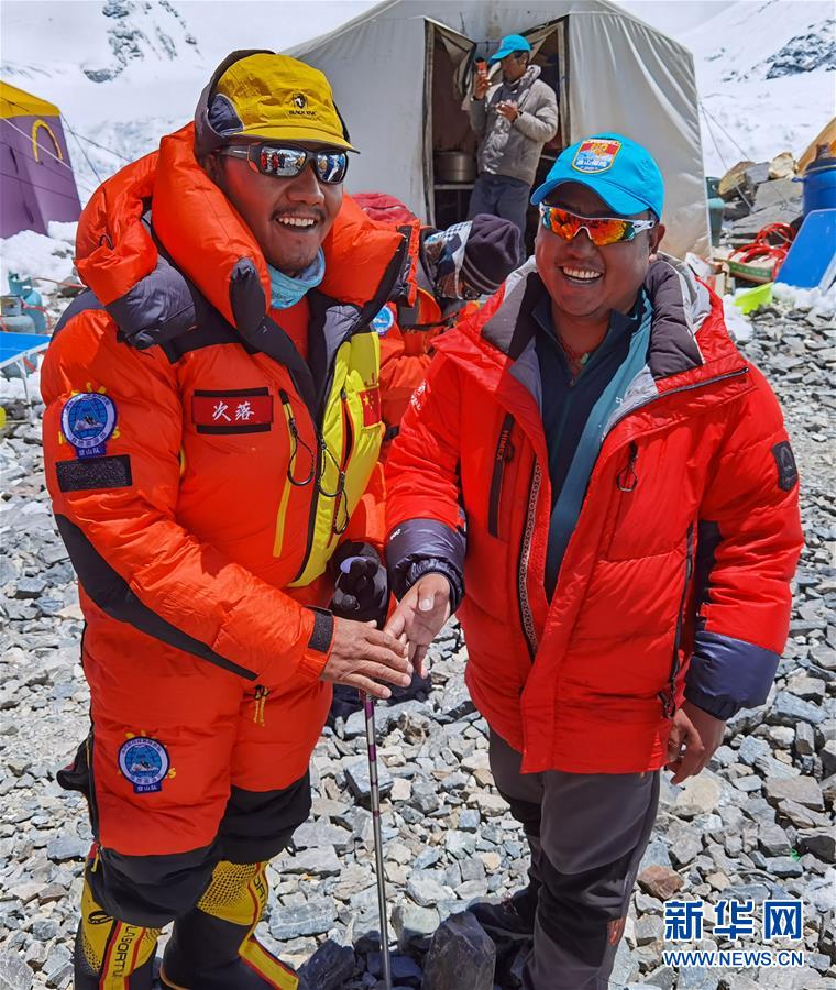5月24日,2020珠峰高程測量登山隊(duì)副隊(duì)長桑珠(右)和沖頂組組長次落(左)在海拔6500米的前進(jìn)營地。新華社特約記者拉巴攝