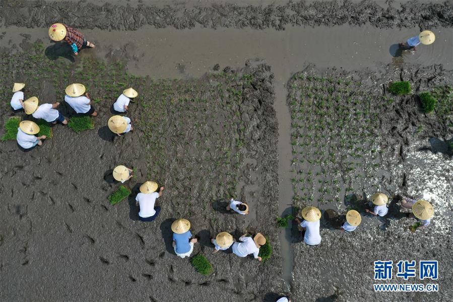 5月24日,小朋友與家長(zhǎng)在稻田里參加親子插秧比賽(無(wú)人機(jī)照片)。當(dāng)日,十余名小朋友在家長(zhǎng)的帶領(lǐng)下來(lái)到浙江省湖州市吳興區(qū)八里店鎮(zhèn)尹家圩糧油植保農(nóng)機(jī)專(zhuān)業(yè)合作社的稻田中,參加親子插秧、稻田捉魚(yú)等農(nóng)事體驗(yàn)活動(dòng)。新華社記者黃宗治攝