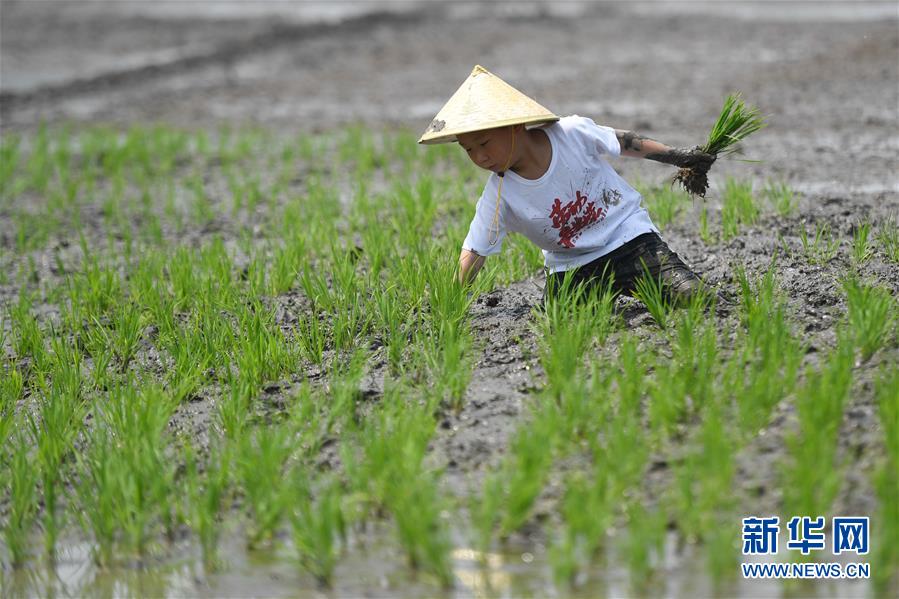 5月24日,一名小朋友在稻田里插秧。當(dāng)日,十余名小朋友在家長(zhǎng)的帶領(lǐng)下來(lái)到浙江省湖州市吳興區(qū)八里店鎮(zhèn)尹家圩糧油植保農(nóng)機(jī)專(zhuān)業(yè)合作社的稻田中,參加親子插秧、稻田捉魚(yú)等農(nóng)事體驗(yàn)活動(dòng)。新華社記者黃宗治攝