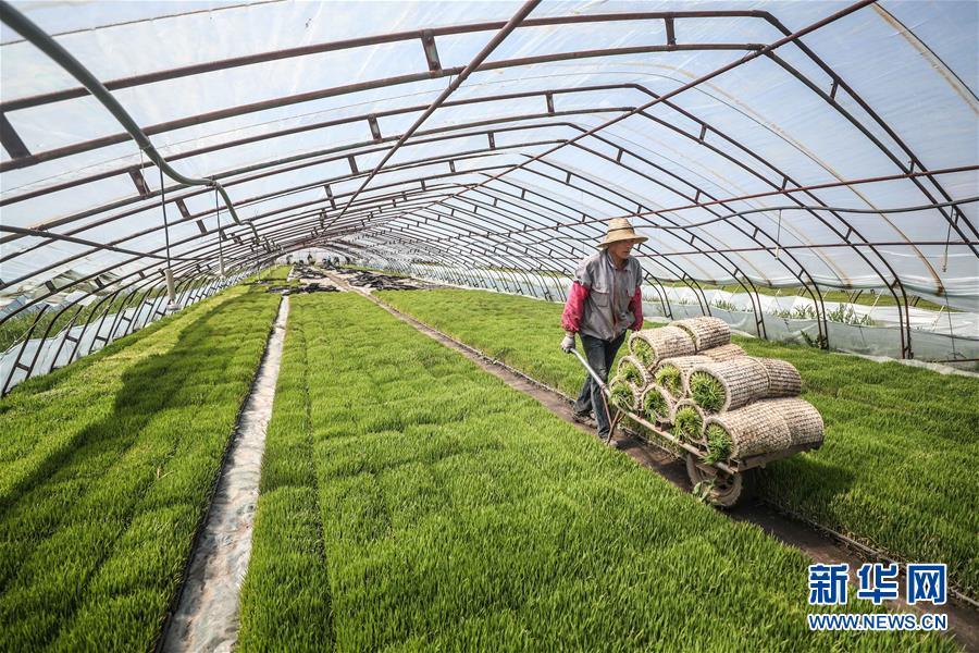 5月24日,盤錦市大洼區(qū)的農(nóng)民在育苗棚內(nèi)搬運符合插秧標準的水稻秧苗。新華社記者潘昱龍攝
