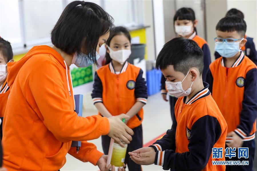 5月25日,貴陽(yáng)市中天北京小學(xué)未來(lái)方舟校區(qū)老師在給學(xué)生噴涂消毒洗手液。新華社記者歐東衢攝