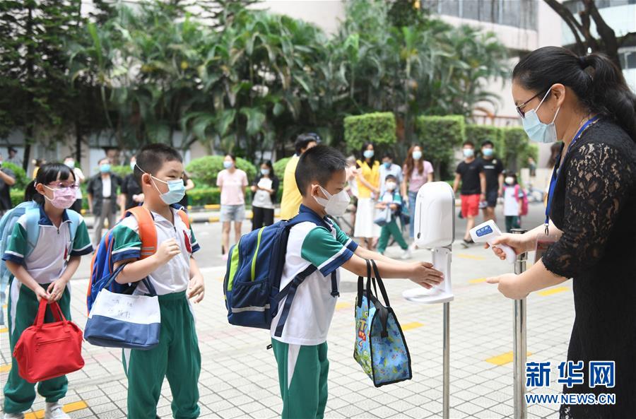 5月25日,廣州市荔灣區(qū)蔣光鼐紀念小學(xué)的老師在校門口為返校學(xué)生檢測體溫。當(dāng)日,廣州市各小學(xué)一至三年級學(xué)生正式開學(xué)復(fù)課。至此,廣州市中小學(xué)各年級已全部開學(xué)復(fù)課。新華社記者盧漢欣攝