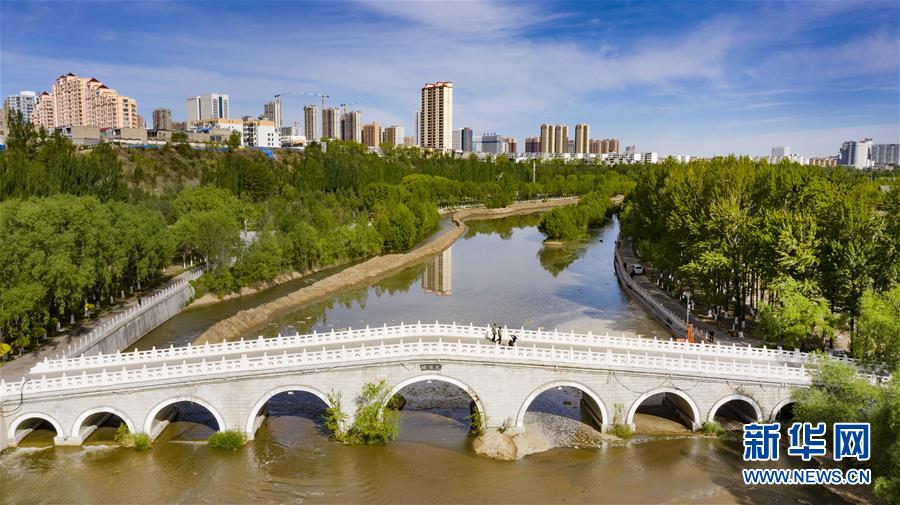 5月24日,市民在榆林市榆溪河生態(tài)長(zhǎng)廊休閑(無(wú)人機(jī)照片)。新華社記者陶明攝