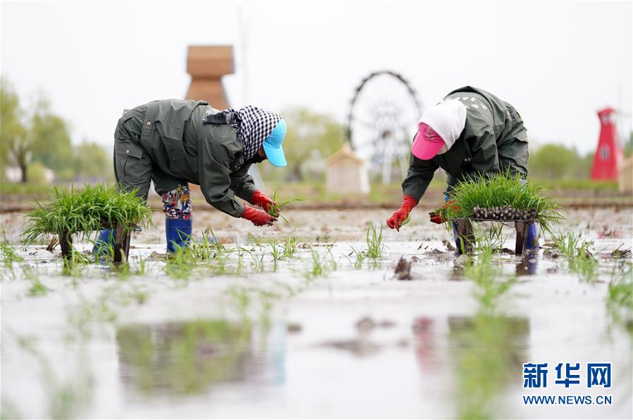 5月22日,在寧安市渤海鎮(zhèn)上官地村一塊稻田中,農(nóng)民在進行插秧。新華社記者王建威攝