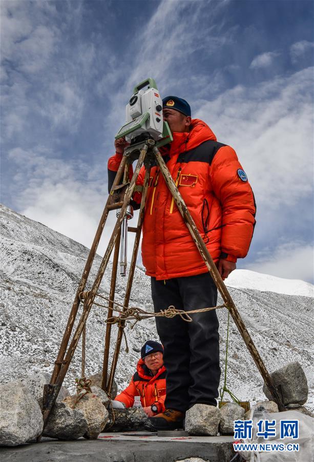 自然資源部第一大地測量隊隊員鄭林(站立者)和武光偉在對珠峰峰頂進行交會觀測(5月27日攝)。新華社記者普布扎西攝