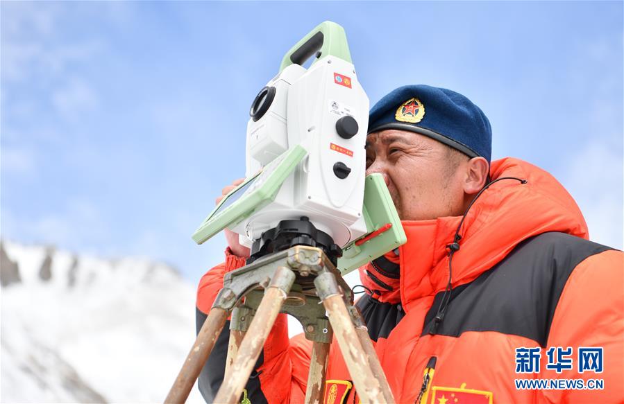 自然資源部第一大地測量隊(duì)隊(duì)員鄭林在使用全站儀對珠峰峰頂進(jìn)行交會觀測(5月27日攝)。新華社記者晉美多吉攝