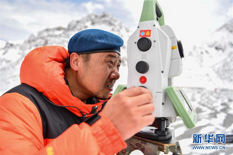 自然資源部第一大地測(cè)量隊(duì)隊(duì)員鄭林在使用全站儀對(duì)珠峰峰頂進(jìn)行交會(huì)觀測(cè)(5月27日攝)。新華社記者晉美多吉攝