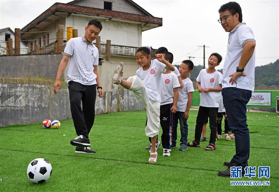 5月27日,在江西省貴溪市金屯鎮(zhèn)金屯村渡坊村小組,志愿者和留守兒童一起進行體育活動。
