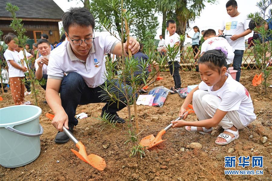 5月27日,在江西省貴溪市金屯鎮(zhèn)金屯村渡坊村小組,志愿者(左)和留守兒童一起種下“成長樹”。