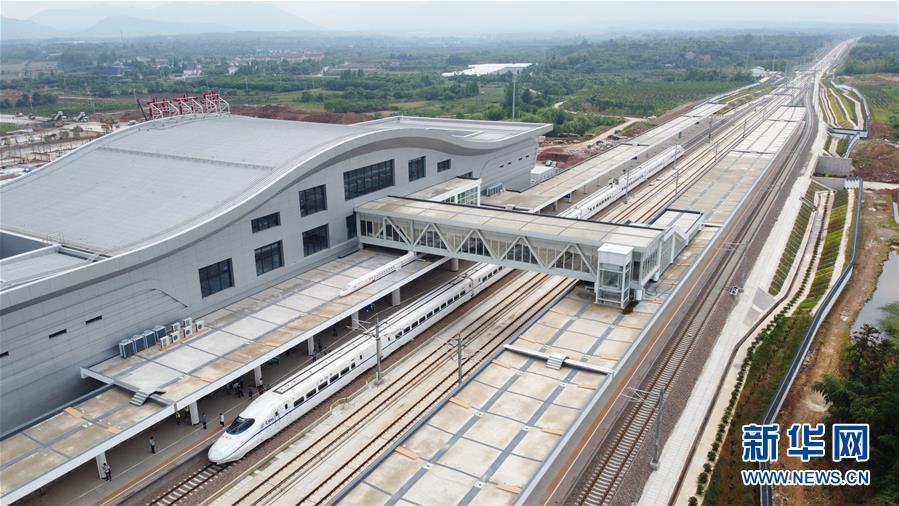 5月27日,試運(yùn)行檢查確認(rèn)列車??吭谏毯虾几哞F安吉站(無人機(jī)照片)。新華社記者張端攝