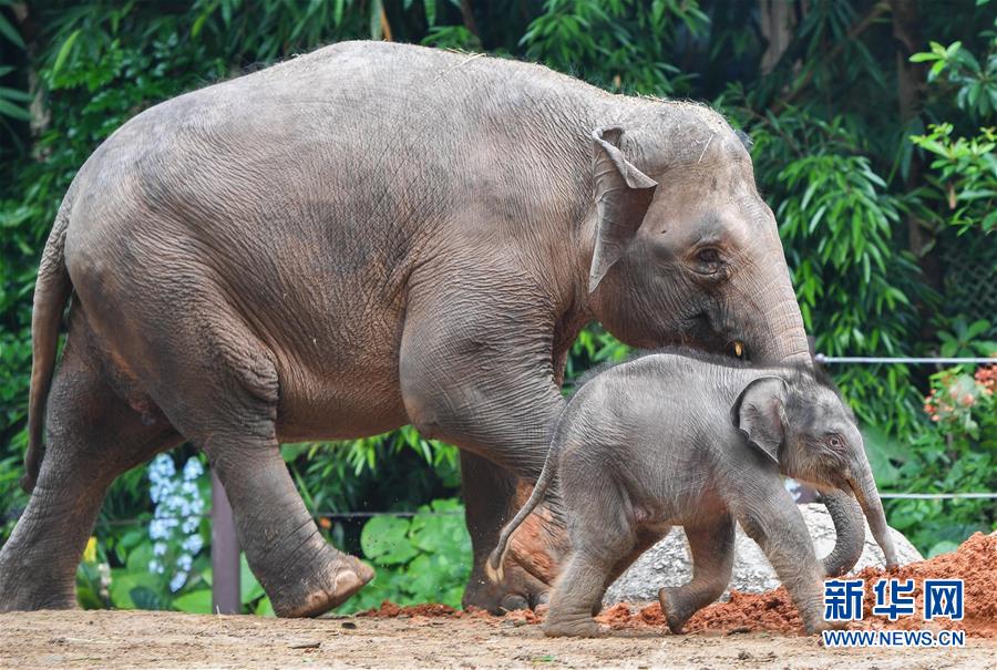 5月27日,廣州長隆的新生亞洲象寶寶在媽媽的陪伴下玩耍。新華社記者劉大偉攝
