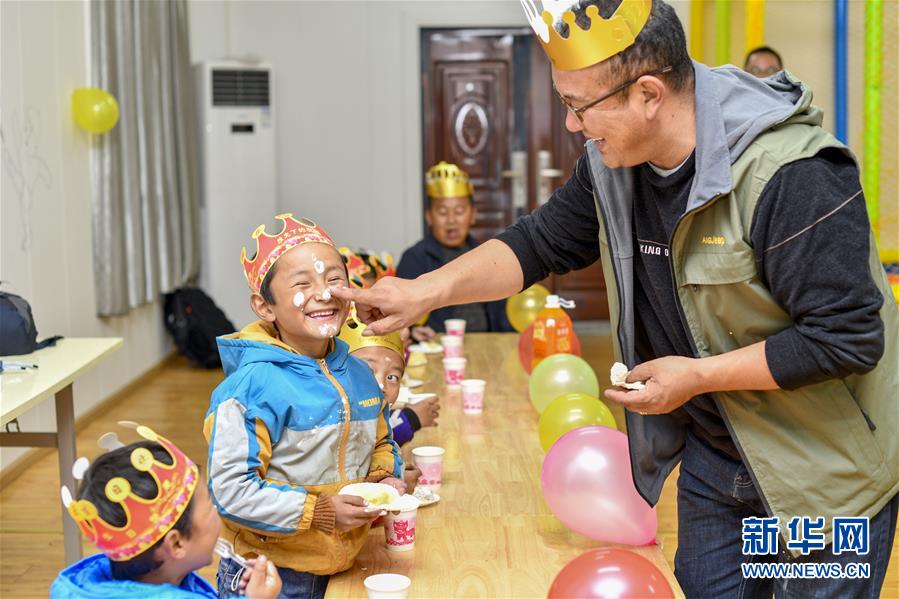 5月27日,玉麥鄉(xiāng)小學(xué)校長朗杰和孩子們一起慶祝“生日”。新華社記者王炳坤攝