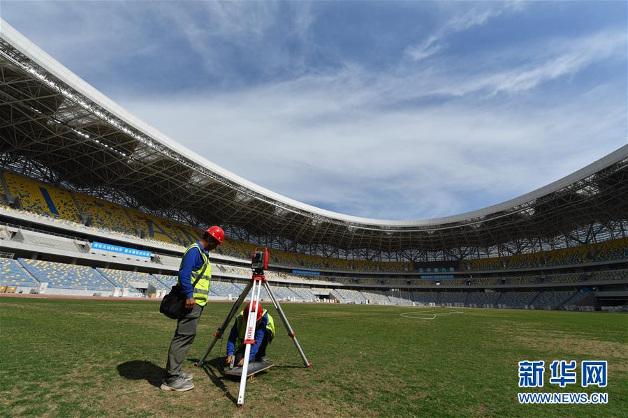 5月29日,工人在西安奧體中心體育場進(jìn)行場地測量。新華社記者張博文攝