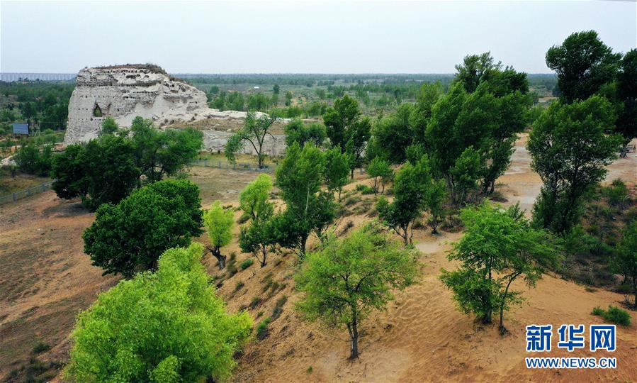 統(tǒng)萬(wàn)城西南角城臺(tái)遺址(5月30日攝,無(wú)人機(jī)照片)。新華社記者劉瀟攝