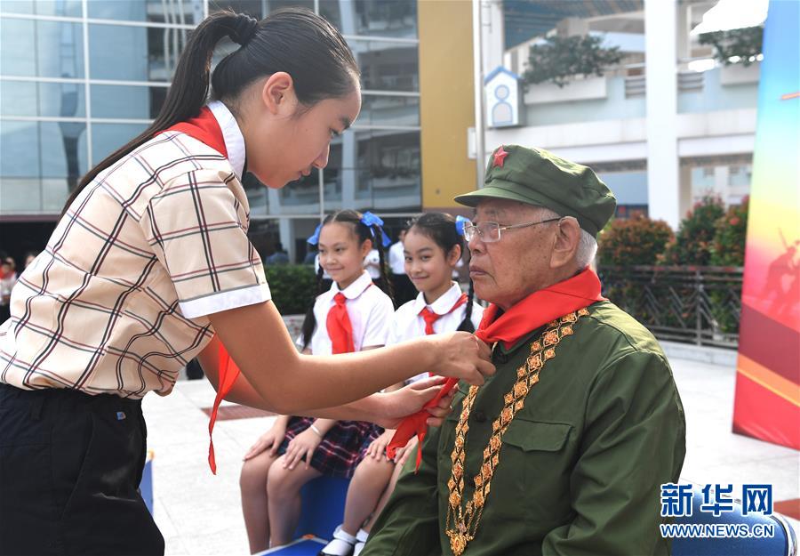 5月29日,少先隊員給李延年戴上紅領巾?!傲弧眹H兒童節(jié)來臨之際,“共和國勛章”獲得者、老一輩戰(zhàn)斗英雄李延年來到廣西南寧市濱湖路小學給孩子們講述戰(zhàn)爭年代的紅色故事,寄語他們好好學習、努力奮斗。孩子們向李延年贈送了師生共繪的“紅色畫卷”,向老英雄致敬。新華社記者周華攝