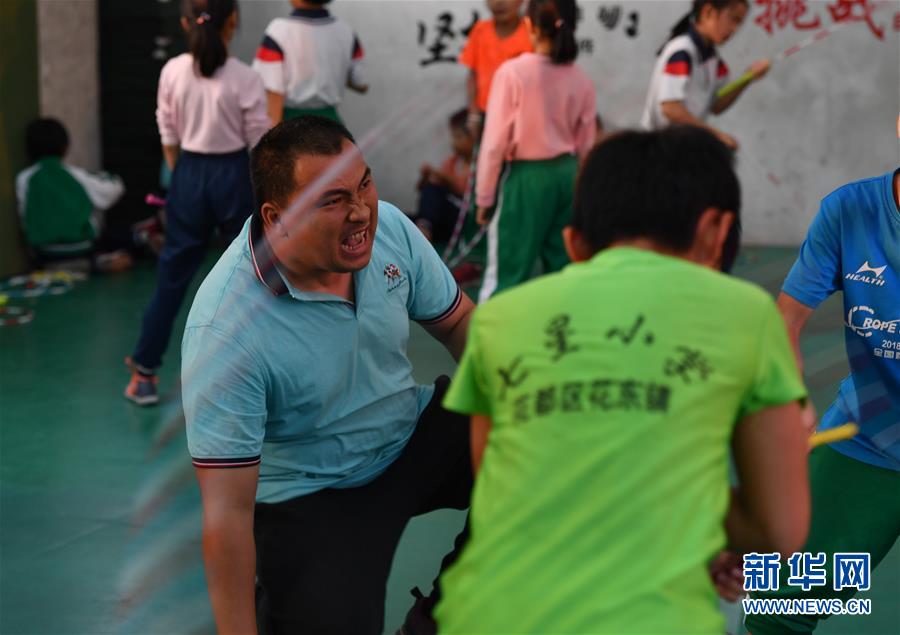 七星小學跳繩隊教練賴宣治(左)正大吼著激勵隊員訓練。正是這位沒有接觸過專業(yè)跳繩訓練的的體育老師把跳繩運動引入學校,十年不懈,領著孩子們從鄉(xiāng)村的小操場跳到世界的大舞臺(2019年11月18日攝)。新華社記者劉大偉攝