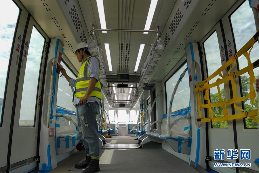 6月3日,工程技術(shù)人員在“云巴”車廂內(nèi)對安裝的電氣設(shè)備進行調(diào)試。近日,重慶市首條“云巴”示范線項目在重慶璧山區(qū)正式亮相。此次發(fā)布的“云巴”采用電能驅(qū)動,具有轉(zhuǎn)彎半徑小、爬坡能力強、噪音低、安全性高、建設(shè)成本低、建造周期短等優(yōu)勢,能為乘客提供更智能、舒適、便捷的出行體驗。據(jù)介紹,璧山區(qū)“云巴”示范線項目自2019年8月開建,線路正線全長15.4km,共設(shè)車站15座,預(yù)計2020年9月全線通車。新華社記者劉潺攝。