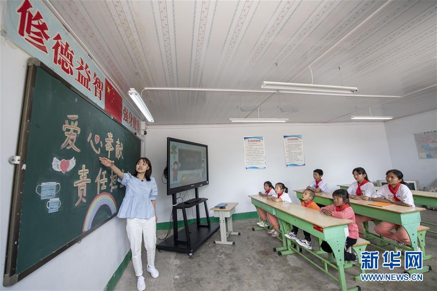 6月2日,馬武寨寄小學(xué)的英語(yǔ)老師陳燕子為學(xué)生們上開學(xué)第一課。新華社記者楊晨光攝。