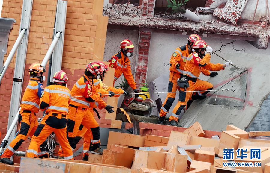 6月3日,救援人員在演練中對倒塌墻體進(jìn)行破拆。新華社記者方喆攝。