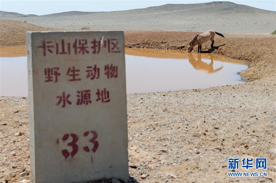 在新疆卡拉麥里山有蹄類野生動(dòng)物自然保護(hù)區(qū),一匹普氏野馬來到33號(hào)水源地飲水(6月3日攝)。新華社記者丁磊攝。
