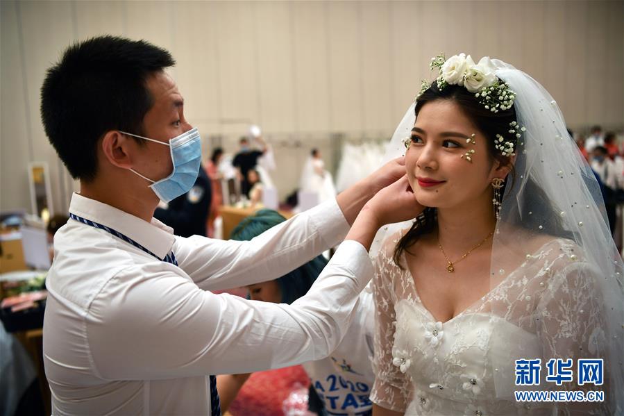 6月6日,曾支援湖北黃岡大別山區(qū)域醫(yī)療中心的湖南省人民醫(yī)院急診科護(hù)師陳建明為同為醫(yī)務(wù)人員的妻子唐嬋佩戴耳環(huán)。 當(dāng)日,來自全國15個(gè)省份的百對(duì)新人在三亞市亞特蘭蒂斯度假區(qū)舉行了一場(chǎng)特殊的集體婚禮,每對(duì)新人中至少有一位參與過抗擊新冠肺炎疫情的工作。 新華社記者 郭程 攝