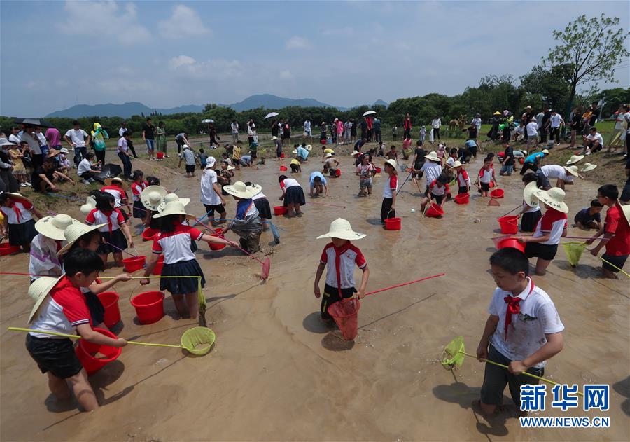 6月7日,孩子和家長(zhǎng)們參加渾水摸魚趣味活動(dòng)。新華社記者徐昱攝