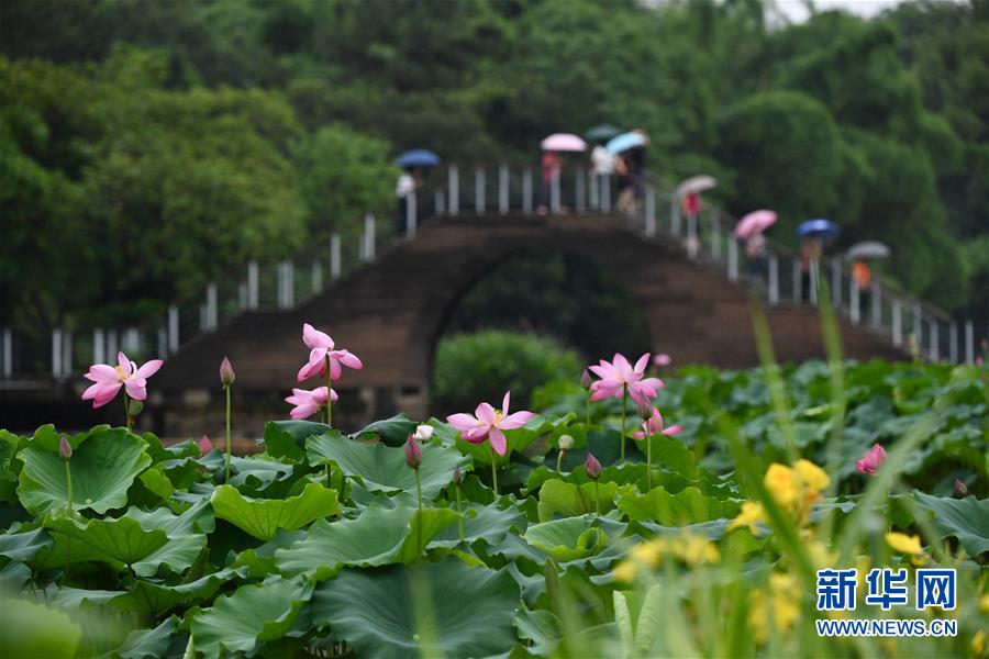 6月7日,一陣小雨過(guò)后,福州金山公園內(nèi)盛開的荷花愈加?jì)善G欲滴,吸引市民前來(lái)游覽。新華社記者姜克紅攝