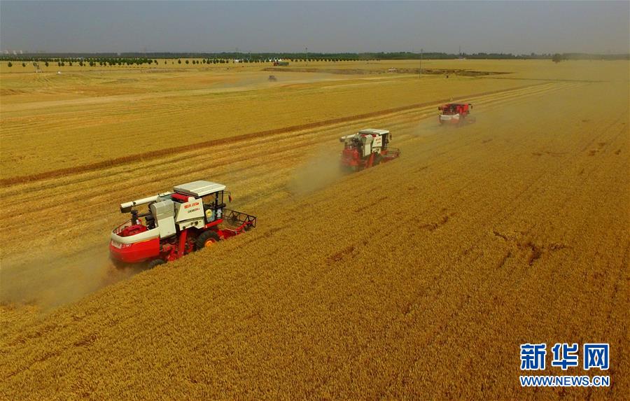 6月8日,聯(lián)合收割機在河北省南和縣閆里鄉(xiāng)閆里村麥田進(jìn)行夏收作業(yè)(無人機照片)。“三夏”期間,河北省預(yù)計組織和調(diào)度小麥聯(lián)合收割機、拖拉機、夏玉米播種機等200萬臺農(nóng)業(yè)機械投入作業(yè)。新華社記者朱旭東攝