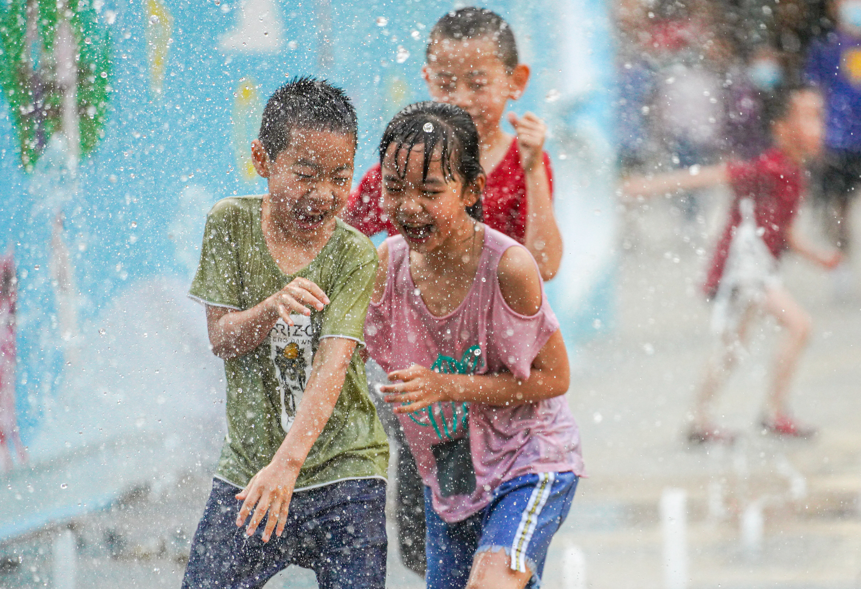 2020年6月9日報(bào)道,近期,今年以來最大范圍高溫天氣“炙烤”北方,多地高溫屢創(chuàng)紀(jì)錄,中央氣象臺(tái)已連續(xù)3天發(fā)布高溫預(yù)警,同時(shí),高溫少雨也導(dǎo)致一些地區(qū)出現(xiàn)嚴(yán)重旱情。圖為2020年6月4日,北京三里屯噴泉廣場,很多孩子聚集在此,水中玩耍異常火爆。