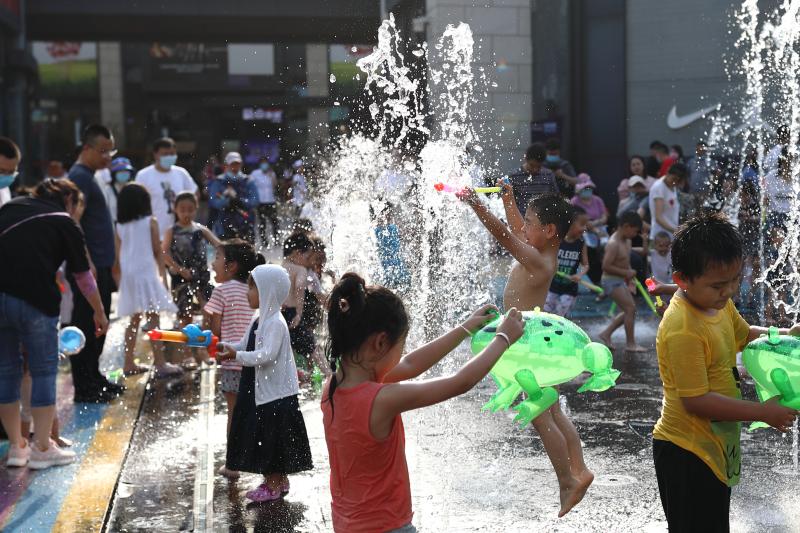2020年6月7日,北京,華西熙LIVE的噴泉水池成為孩童的戲水降暑天堂。北京6日下午發(fā)高溫藍(lán)色預(yù)警,預(yù)計(jì)6月7日至8日,北京大部分地區(qū)日最高氣溫達(dá)36℃以上。