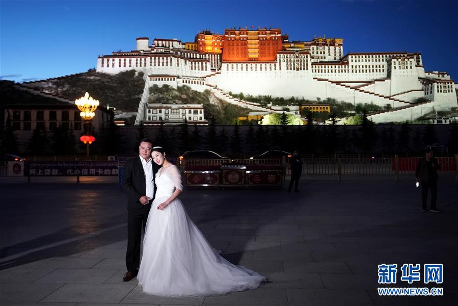 游客在布達(dá)拉宮廣場拍照(6月8日攝)。夜幕降臨,西藏拉薩布達(dá)拉宮燈光璀璨,夜景迷人。新華社記者詹彥攝