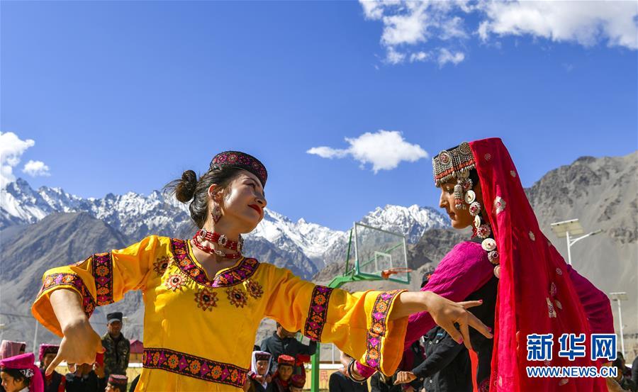 在熱斯喀木村,新疆塔什庫(kù)爾干塔吉克自治縣文工團(tuán)演員(左)與村民一起跳舞(6月6日攝)。新華社記者胡虎虎攝
