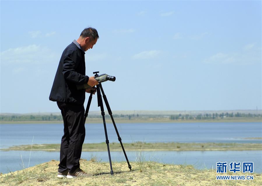 6月9日,鄂爾多斯遺鷗國(guó)家級(jí)自然保護(hù)區(qū)東勝管理站站長(zhǎng)任永奇,用望遠(yuǎn)鏡觀察泊江海子鳥類生活情況。近年來(lái),在當(dāng)?shù)卣亩喾N措施治理下,曾經(jīng)水面萎縮的內(nèi)蒙古自治區(qū)鄂爾多斯市境內(nèi)的泊江海子水量逐漸恢復(fù)。近期,包括遺鷗在內(nèi)的40多種鳥類來(lái)此棲息,泊江海子重新成為鳥類的樂(lè)園。新華社記者賈立君攝