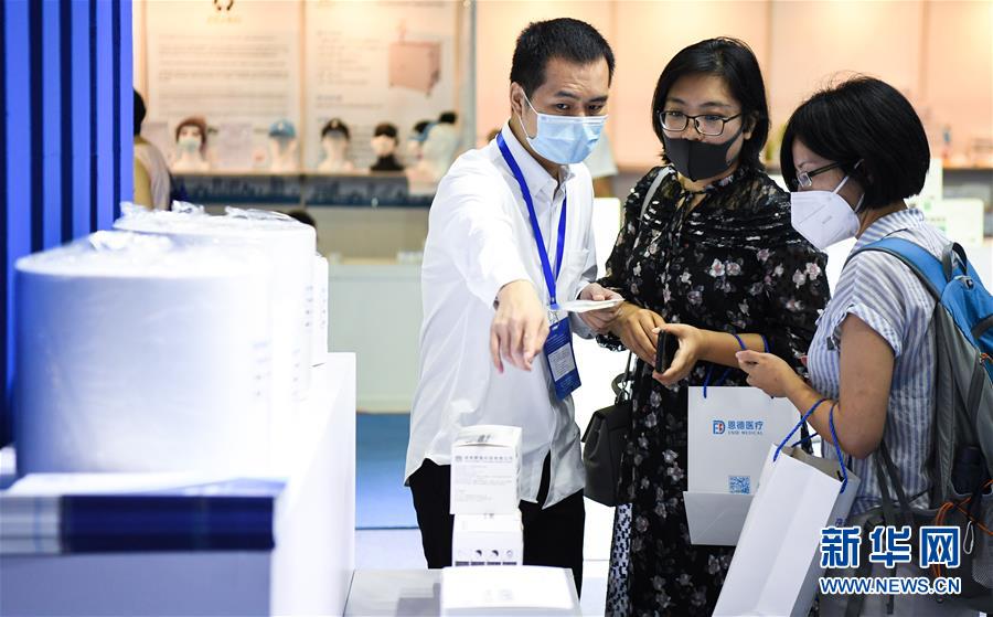 6月10日,一名參展商(左)向采購商講解口罩生產(chǎn)原料及工藝。當(dāng)日,廣州國際防疫物資展覽會在保利世貿(mào)博覽館舉行。本次展會面積共計3.6萬平方米,設(shè)有防疫產(chǎn)品、設(shè)備、綜合服務(wù)、原輔料等4個展區(qū),參展企業(yè)約600家。新華社記者鄧華攝