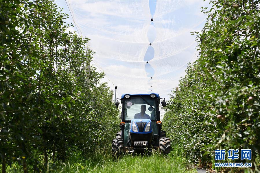 6月11日,農(nóng)民在貴州省威寧縣一處蘋果基地里駕駛農(nóng)機(jī)管護(hù)果園。近日,貴州省威寧彝族回族苗族自治縣的農(nóng)民搶抓農(nóng)時,對蘋果園進(jìn)行疏果、除草等田間管理,呈現(xiàn)出一派夏管農(nóng)忙景象。威寧縣蘋果種植面積50余萬畝,蘋果產(chǎn)業(yè)已逐步成為當(dāng)?shù)剞r(nóng)民增收致富的主導(dǎo)產(chǎn)業(yè)之一。新華社記者楊文斌攝。