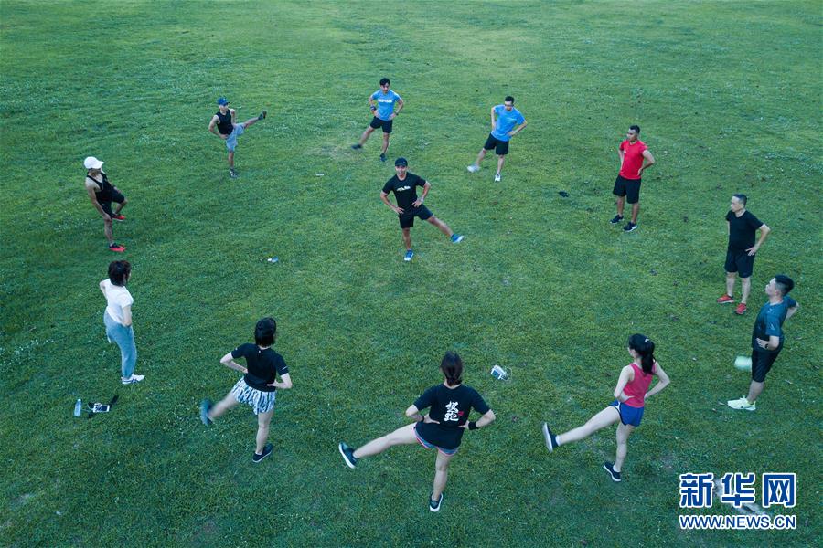 6月11日傍晚,在??谌f綠園,市民在夜跑前做熱身運(yùn)動(dòng)(無人機(jī)拍攝)。近年來,夜跑成為越來越多都市人熱衷的健身方式之一。在海南???,每當(dāng)夜幕降臨,“夜跑族”來到??谌f綠園、世紀(jì)公園等夜跑場所跑步,用一身酣暢淋漓的汗水?dāng)[脫白天工作中的壓力,享受跑步帶來的歡愉。新華社記者 蒲曉旭 攝