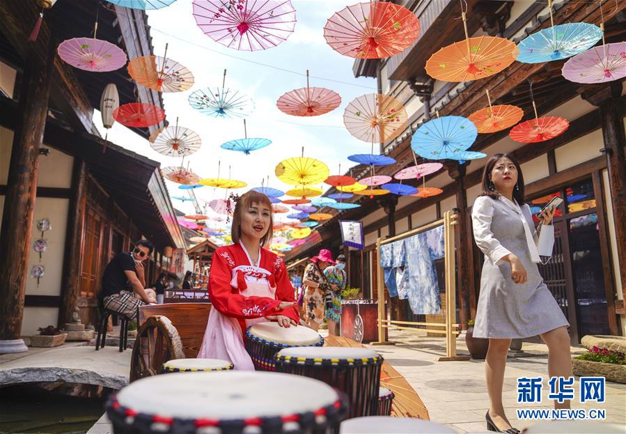 6月13日,在長(zhǎng)春市世茂蓮花山小鎮(zhèn)寬厚里商街,表演者身穿漢服、古裝進(jìn)行表演展示。當(dāng)日是“文化和自然遺產(chǎn)日”。吉林長(zhǎng)春首屆蓮花山消夏生活節(jié)在世茂蓮花山小鎮(zhèn)舉行?;顒?dòng)將非遺展示與假日消暑休閑相結(jié)合,讓游人在“古色古香”的油紙傘巷中品傳統(tǒng)文化魅力,享夏日休閑愜意。新華社記者許暢攝。