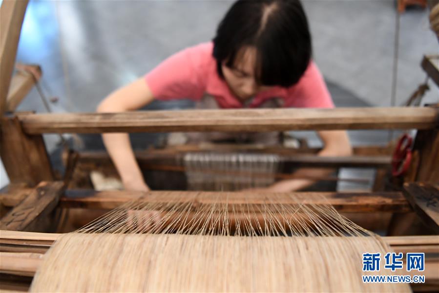 6月12日,在重慶榮昌的天運(yùn)夏布會館,非遺傳承人馬琳沁在用織布機(jī)織造榮昌夏布。新華社記者 唐奕 攝