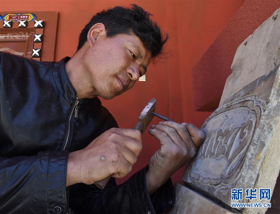 這是在四川省阿壩藏族羌族自治州壤塘縣棒托石刻公園拍攝的石刻傳習(xí)所所長班瑪羅爾吾(6月13日攝)。新華社記者 沈伯韓 攝