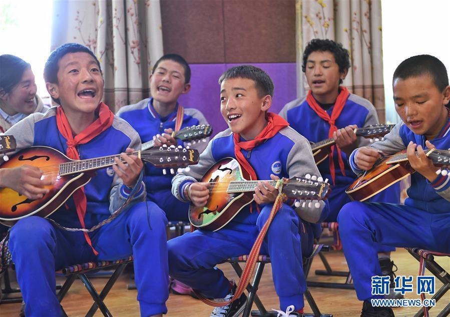 6月14日,孩子們在阿壩縣民族寄宿制小學(xué)內(nèi)的少年宮里用曼陀鈴進(jìn)行彈唱。新華社記者 劉坤 攝