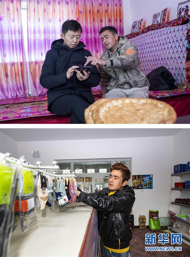拼版照片:上圖為新疆塔什庫(kù)爾干塔吉克自治縣扶貧工作人員付超(左)向都熱·加爾曼的小兒子征求就業(yè)創(chuàng)業(yè)意愿(2019年11月25日攝);下圖為都熱·加爾曼的小兒子通過(guò)小額貸款在易地扶貧搬遷安置點(diǎn)開(kāi)辦了小商店(6月2日攝)。新華社記者胡虎虎攝