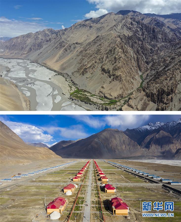 拼版照片:上圖為新疆塔什庫(kù)爾干塔吉克自治縣熱斯喀木村易地扶貧搬遷前一處散居的居住點(diǎn)(2019年7月8日攝,無(wú)人機(jī)照片);下圖為實(shí)施易地扶貧搬遷后的熱斯喀木村新貌(6月6日攝,無(wú)人機(jī)照片)。新華社記者胡虎虎攝