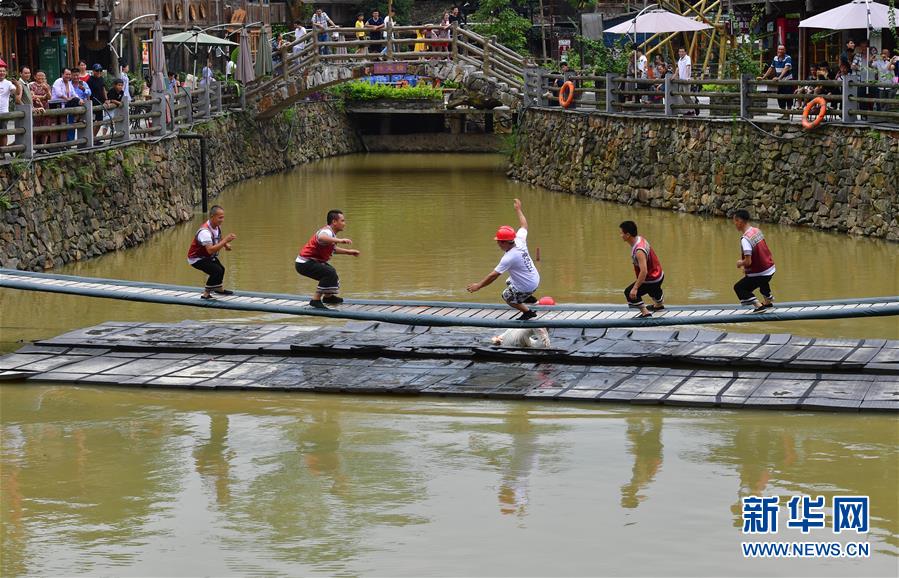 在廣西融水雙龍溝森林旅游度假區(qū)夢(mèng)嗚苗寨,幾位搬遷戶(hù)協(xié)助游客挑戰(zhàn)“搖擺橋”(6月21日攝)。近年來(lái),融水打造原生態(tài)苗族文化體驗(yàn)園——夢(mèng)嗚苗寨,讓搬遷進(jìn)城的貧困戶(hù)住進(jìn)復(fù)原建設(shè)的老房子。景區(qū)提供綠化保潔、游樂(lè)設(shè)施管理、民族歌舞表演等工作崗位,多渠道增加貧困戶(hù)收入。新華社記者黃孝邦攝