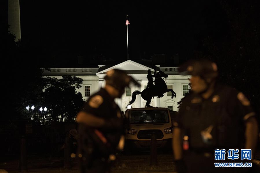 6月22日,警察在美國華盛頓白宮附近警戒。美國警察和示威者22日晚在首都華盛頓市白宮北側(cè)拉斐特廣場(chǎng)發(fā)生沖突并對(duì)峙。美國總統(tǒng)特朗普在社交媒體上說,許多人因破壞廣場(chǎng)上美國前總統(tǒng)安德魯·杰克遜的雕像及附近圣約翰圣公會(huì)教堂被逮捕。新華社記者劉杰攝