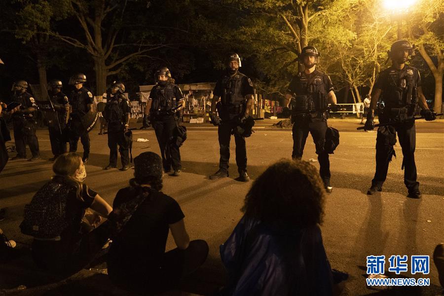 6月22日,警察和示威者在美國華盛頓白宮附近對峙。美國警察和示威者22日晚在首都華盛頓市白宮北側(cè)拉斐特廣場發(fā)生沖突并對峙。美國總統(tǒng)特朗普在社交媒體上說,許多人因破壞廣場上美國前總統(tǒng)安德魯·杰克遜的雕像及附近圣約翰圣公會教堂被逮捕。新華社記者劉杰攝