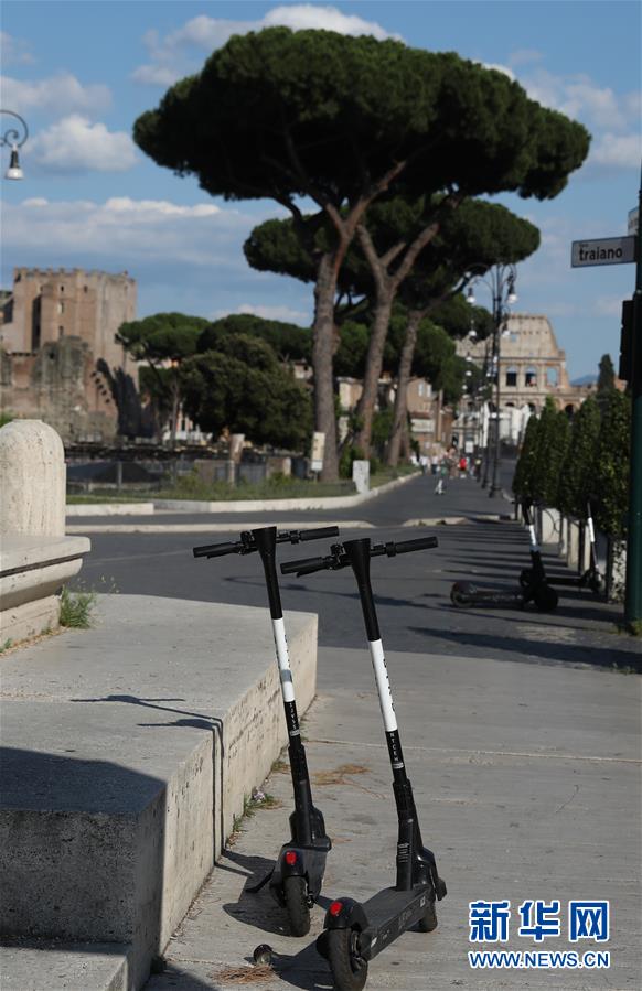 6月23日,在意大利首都羅馬,街頭停放著共享電動(dòng)踏板車。新華社記者程婷婷攝