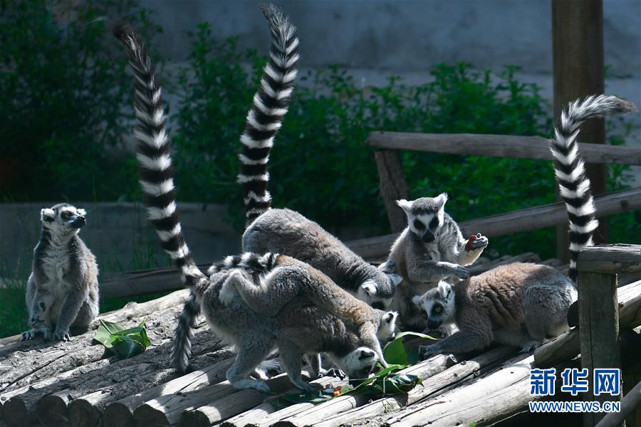 6月25日,在青海省西寧野生動(dòng)物園,一群環(huán)尾狐猴在享用小朋友們包的粽子。新華社記者 張龍 攝