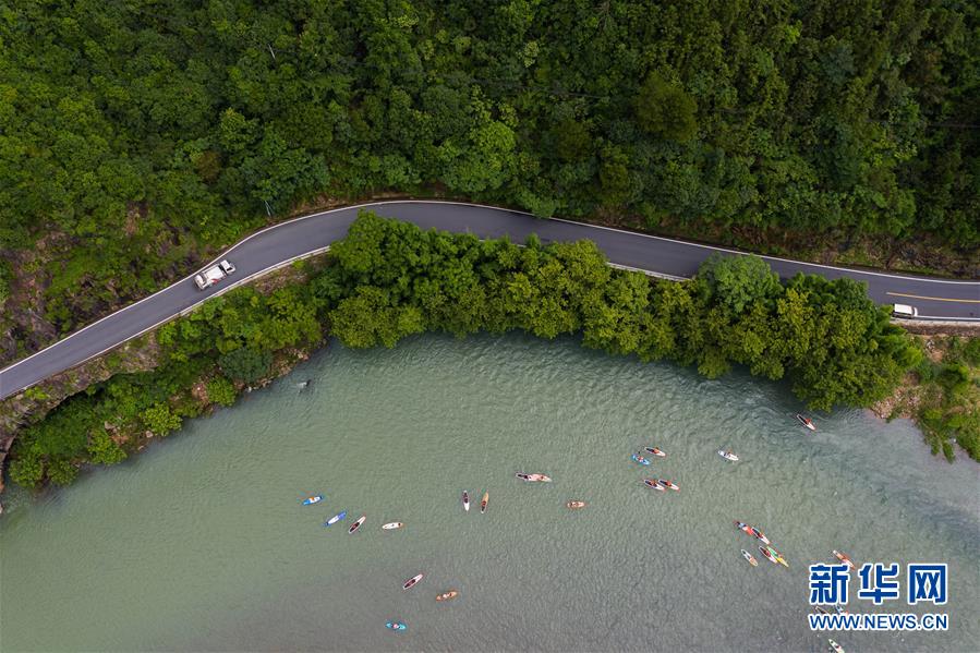 水上運動愛好者在杭州市富陽區(qū)湖源鄉(xiāng)的壺源溪上體驗槳板運動的樂趣(6月28日攝,無人機照片)。近期,浙江省杭州市富陽區(qū)場口鎮(zhèn)、常安鎮(zhèn)和湖源鄉(xiāng)組團開啟了一場夏季“綠水青山嘉年華”。這幾個壺源溪流域鄉(xiāng)鎮(zhèn)整合生態(tài)旅游資源,組團開發(fā)山村旅游項目,游客可以參與壺源溪水上游樂、露營永安山頂、特色農(nóng)產(chǎn)品集市和瓜果節(jié)等特色活動。新華社記者徐昱攝