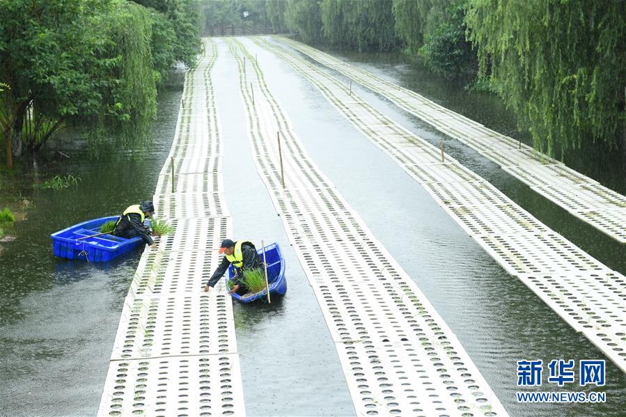 6月29日,工作人員在吳興區(qū)湖東街道的“水上稻田”插秧。今年以來,浙江湖州吳興區(qū)湖東街道開始在轄區(qū)河道大規(guī)模推廣“水上稻田”新型農(nóng)業(yè)項(xiàng)目,利用浮島進(jìn)行特種水稻種植,既能凈化水體,又能產(chǎn)出生態(tài)稻谷?!八系咎铩鳖A(yù)計(jì)在11月實(shí)現(xiàn)收割。新華社記者翁忻旸攝